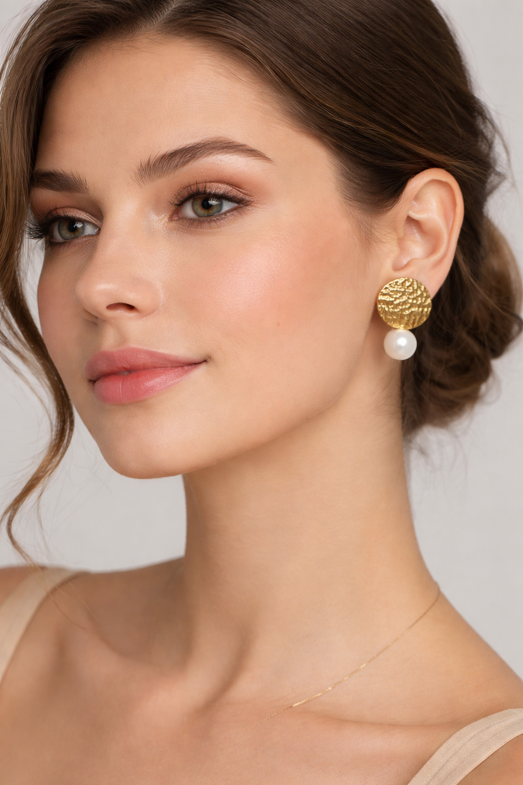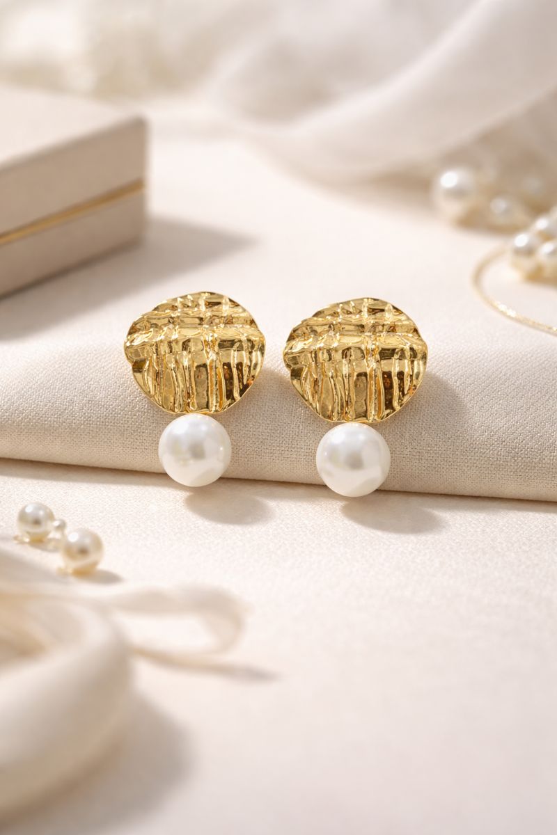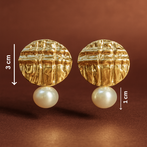 Golden textured discs meet soft pearl drops, creating a jhumka-inspired charm with a modern twist. Har drop mein hai noor, har shine mein hai softness.
